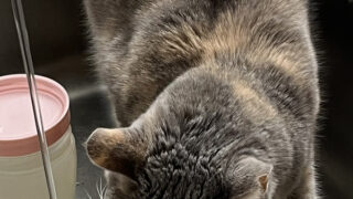 エピが珍しくキッチンに水を飲みに来ていました。ルナが学校に行っていて留守だったから安心して水飲みに来たのかな?