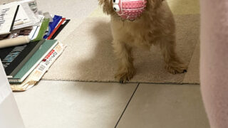 ボール遊びが大好きなルナは、リーフォーム中の部屋の荷物で一杯の中でも遊ぼうとボールを持ってきます。投げるスペースがないよ!