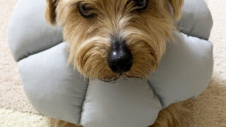 犬 エリザベスカラー 術後2日経ってルナは少しずつ元気になってきました。エリザベスカラーを布製のものに替えたので、あちこちぶつかるのが減って、フードはスムーズに食べられて、ウチの中で少しボール遊びもできます。エリザベスを替える前に本棚にお尻を突っ込んで寝ている姿... 2026.04.30 犬