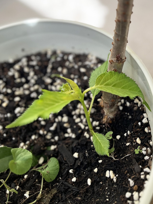 更に根元を見ると、土の中から小さな芽が出ていました。あの過酷な暑さを耐えながらどこにこんなエネルギーを残していたのでしょう!2本に増えてくれた桜の木をこれからも見守っていくことにしましょう。