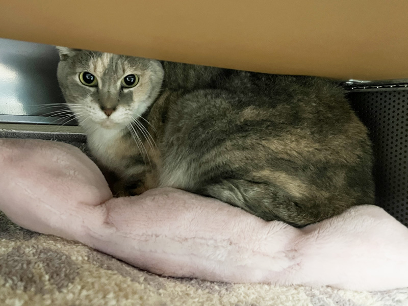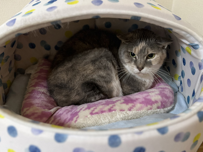 寒くなってきたね 猫 2025.10.31 寒くなってきたからでしょう、エピがハウスにいる時間が長くなってきました。ハウスは囲われているからやっぱり暖かいよね。けれども一日中ハウスにいる訳ではなく、何回かハウスとパソコンラックを往復しています。そして夜中は必ずパソコンラックの方へ行ってしまうのですが、ハウスが置いてある部屋に飼い主とルナが眠りに来るので、どうもそれを避けているようです💦
