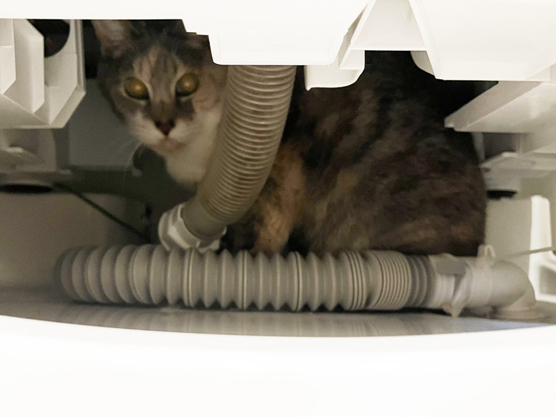 エピの居場所 猫 2025.11.09 明日からのプチリフォームに備えて家具を別の部屋に移す作業をしました。エピが良く居るハウスやパソコンラックも動かしたのですが、すぐにエピはどこかに隠れてしまいました。エピはどこに行ったのか中々見つかりませんでしたが、やっと洗濯機の下の放水パンのところにいるのを見つけました。しばらくしたら移動先にあるハウスかパソコンラックを見つけて落ち着いてくれるといいのですが…。フードの時間にはちゃんと食べに来たので、やや安心です。