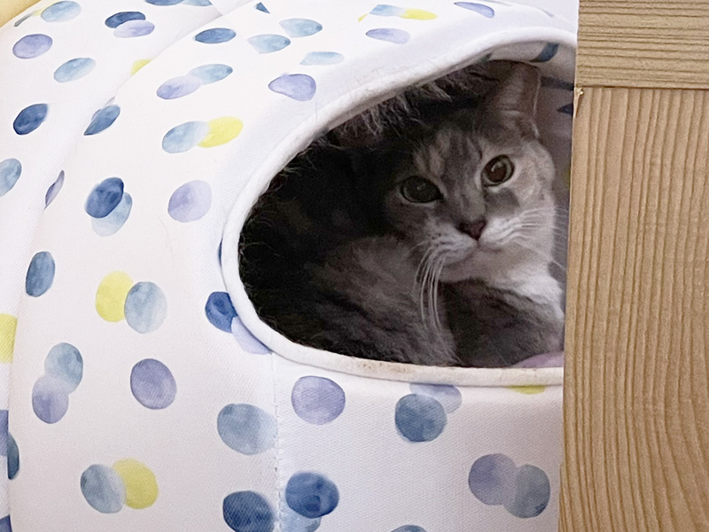 エピの居場所-つづき 猫 2025.11.10 朝になるとエピは荷物の山の中からハウスを見つけ出していました。そこからパソコンラックに移動したりと、エピなりの日常を送り始めたようです。数日間辛抱してね。