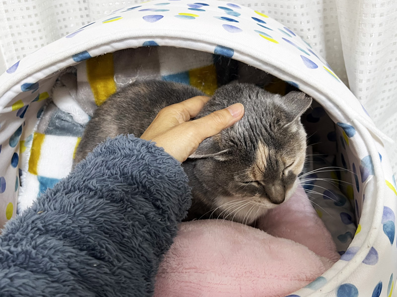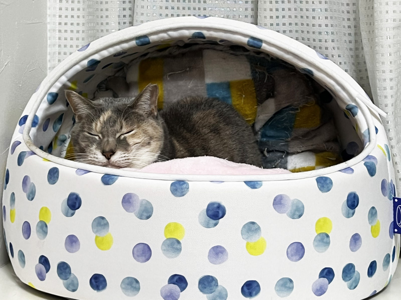落ち着いた? 猫 2025.12.07 エピは防水パンの前にいるのを見かけたりしましたが、結局ハウスに落ち着いてくれたようです。洗濯の度に出なきゃいけない防水パンより、ふわふわのマットが置いてあるハウスの方がいいでしょ?エピが寒くないようにマットを何枚も入れたよ。撫でさせてくれたり、飼い主が部屋にいてもうつらうつらしたりしています。