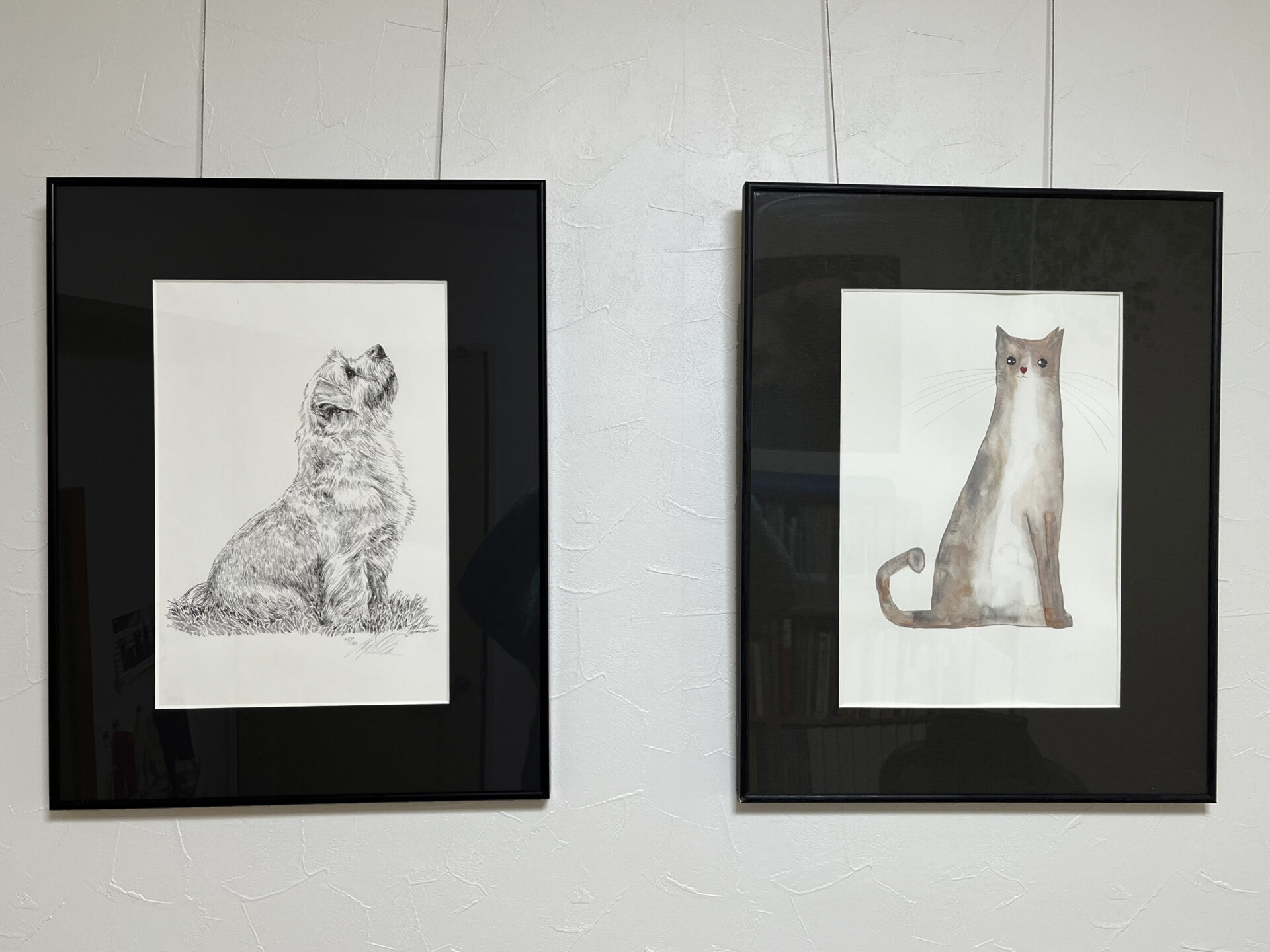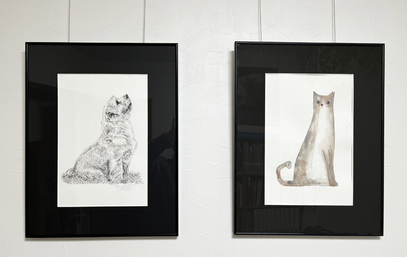 プチリフォームの時にピクチャーレールを付けてもらいました。そこで、以前から持っていたノーフォークテリアのリトグラフに合うように、同じサイズで飼い主がエピの水彩を描いて2枚を飾ってみました。