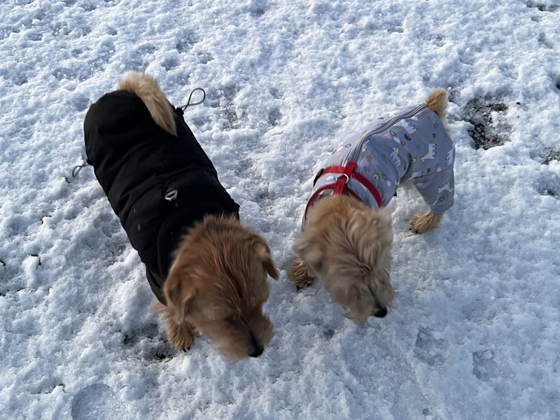 昨晩雪が降って、ほんの少しだけ積もりました。すぐに溶けてしまうレベルです。ワンコ達はいつもと変わらずですね。