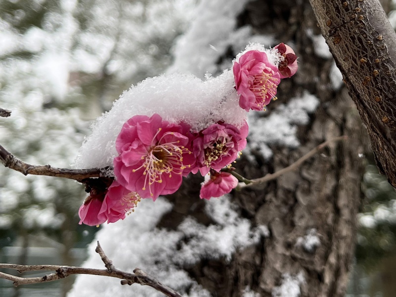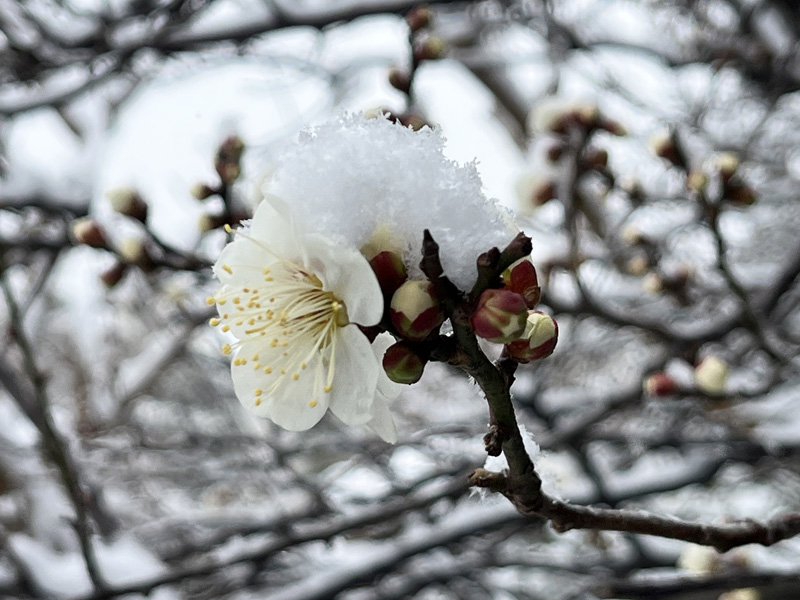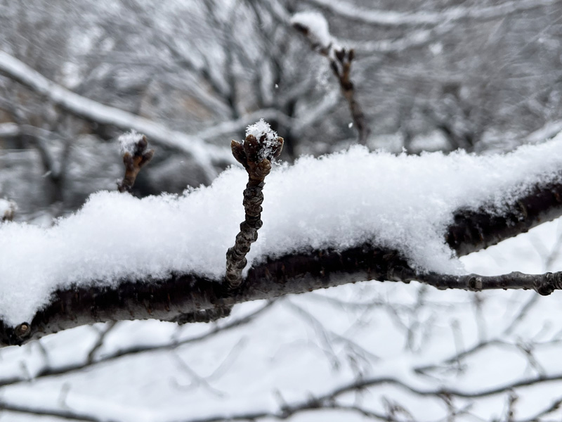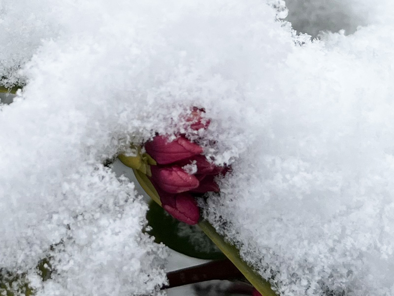昨日の雪の日、雪が積もった花や蕾を見つけました。今日は快晴で雪も解けてほっとしたね。