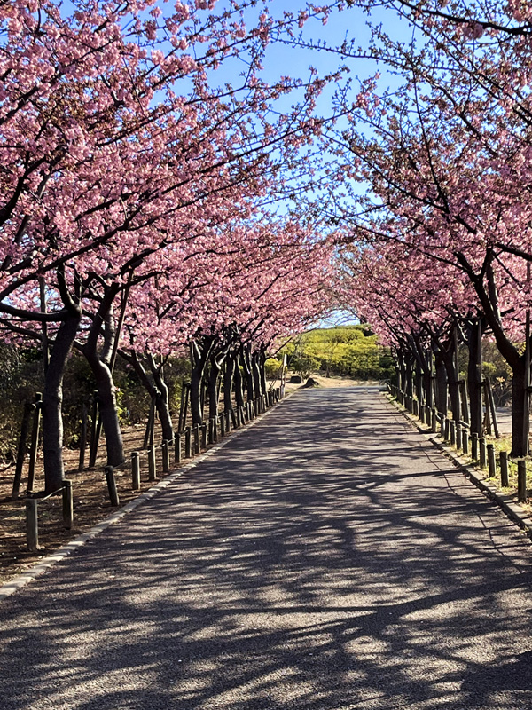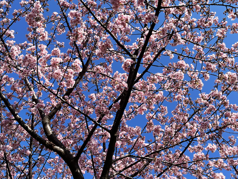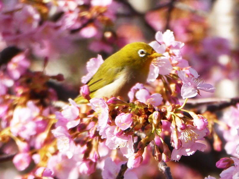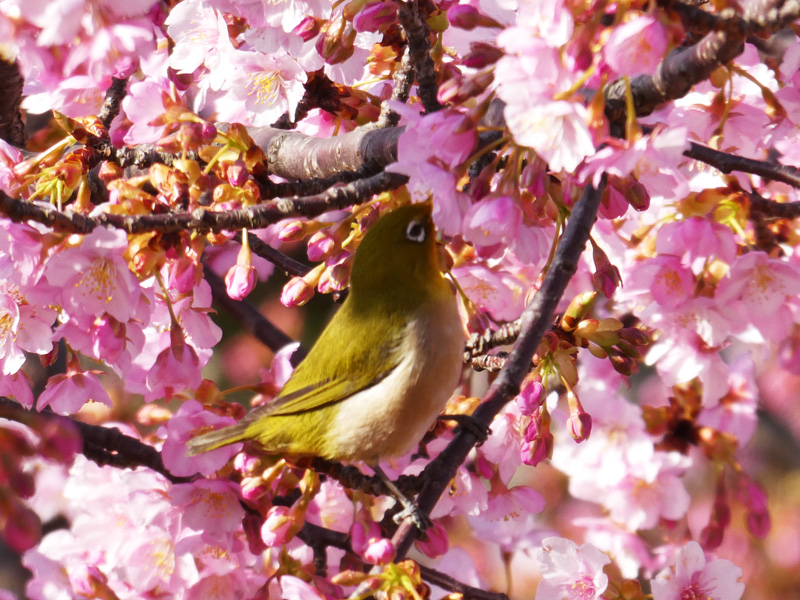 公園の河津桜が見頃です。蜜を吸いにメジロもやってきました。