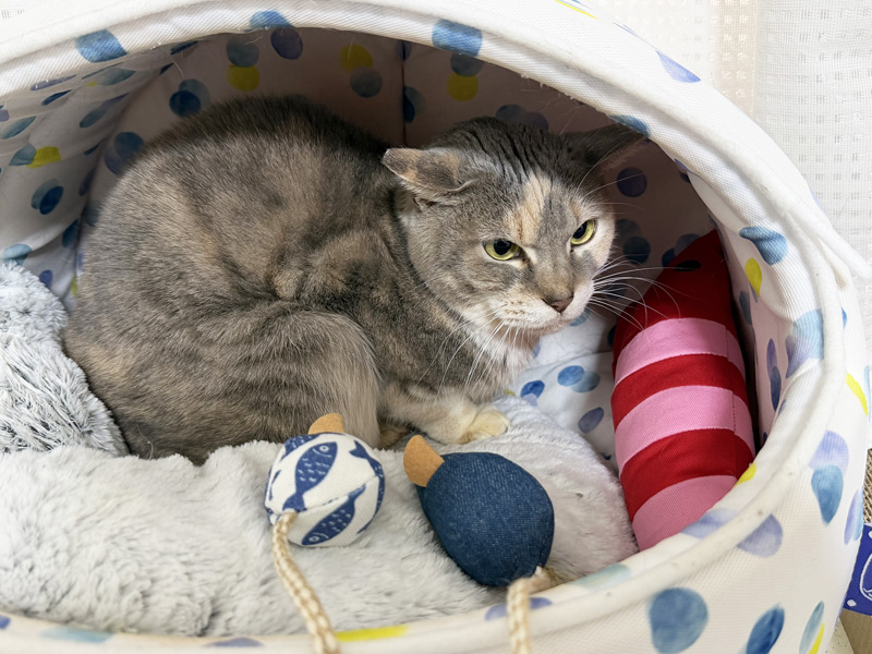 エピのおもちゃ 猫 2026.03.11 エピはおもちゃに全く興味がない猫なのですが(目の前でふりふりしても微動だにせず)、もしかしたら気が変わるかも~と思っていくつか新しくおもちゃを買ってみました。刺激が加わると音を出すネズミのぬいぐるみ・ちょっと大きめのエビのぬいぐるみ・床に置く周りにボールが入っている爪とぎです。エビには全くの無関心、音を出すネズミに対しては唸ってしまいました💦 爪とぎはそのうち使ってくれるかな~~⁇ネズミは撤収してエビはそのままにしてちょっと様子を見ることにします。