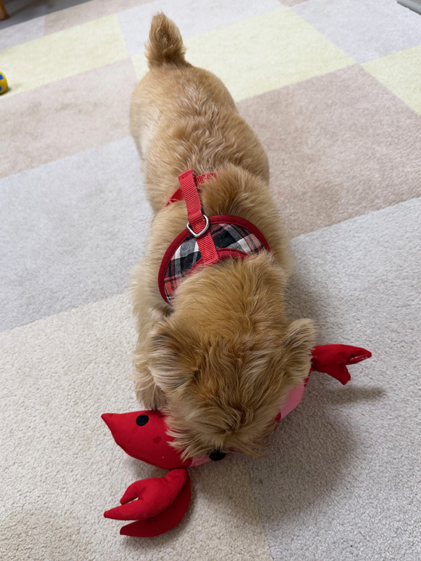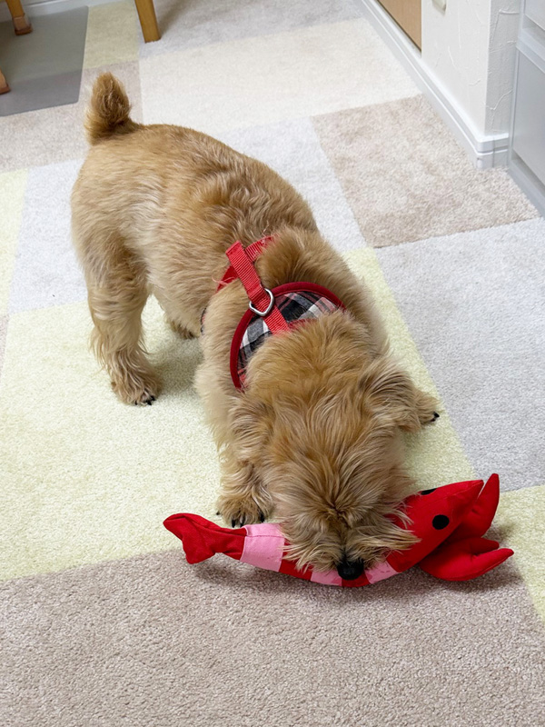 エビのおもちゃ 犬 2026.04.09 エピが全く関心を示さなかったエビのおもちゃはルナにあげることにしました。元々包みからこのおもちゃを取り出した時にルナは大騒ぎだったので、エピ的にも異存はないと思います。